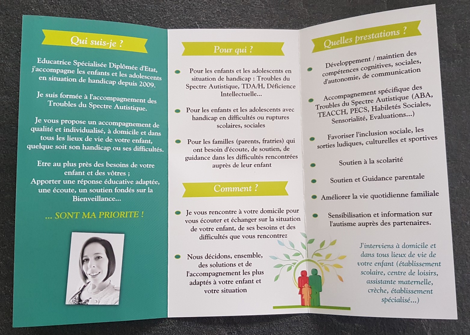 Je vous propose également une Guidance Parentale : connaissance de l'autisme, de ses particularités ; mise en place d'outils et de méthodes spécifiques ; soutien et écoute attentive ; aide dans les démarches administratives...