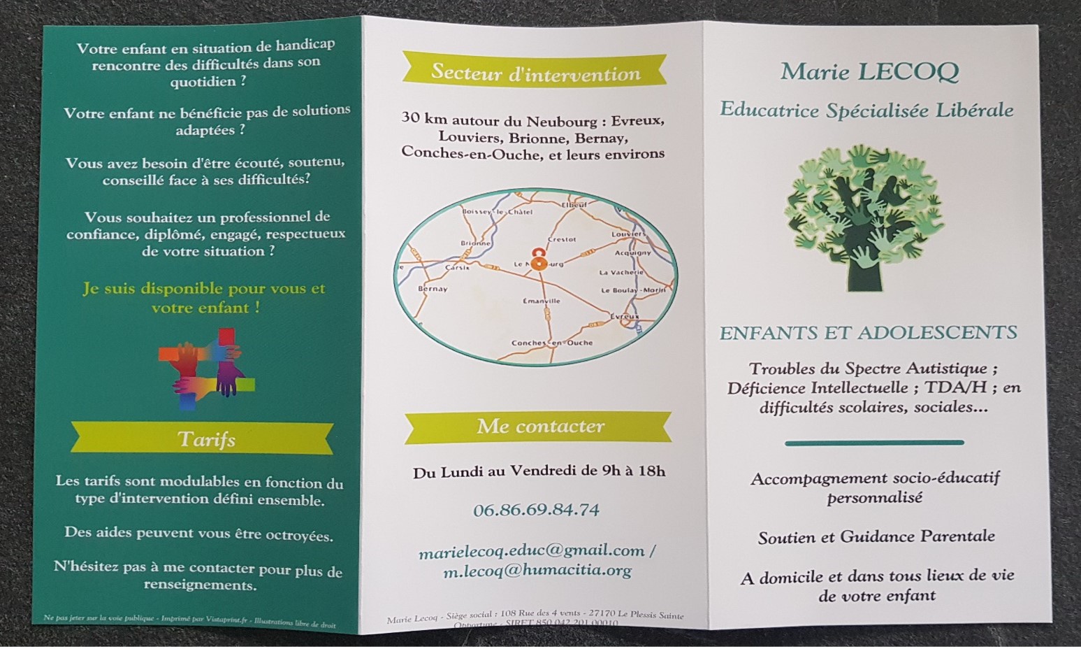 Information(s) complémentaire(s)Éducatrice spécialisée libérale, je vous propose des interventions éducatives auprès de votre enfants ou adolescent avec TSA. Expérience auprès de ce public depuis 2009. Je suis formée aux méthodes et outils spécifiques à l'autisme reconnus des bonnes pratiques de la HAS (ABA, TEACCH, PECS, Habiletés sociales, Sensorialité, évaluations, PEP-3, etc.). J'interviens dans tous les domaines d'apprentissages et de compétences, en respect des besoins de votre enfant et de son rythme, et en toute bienveillance.