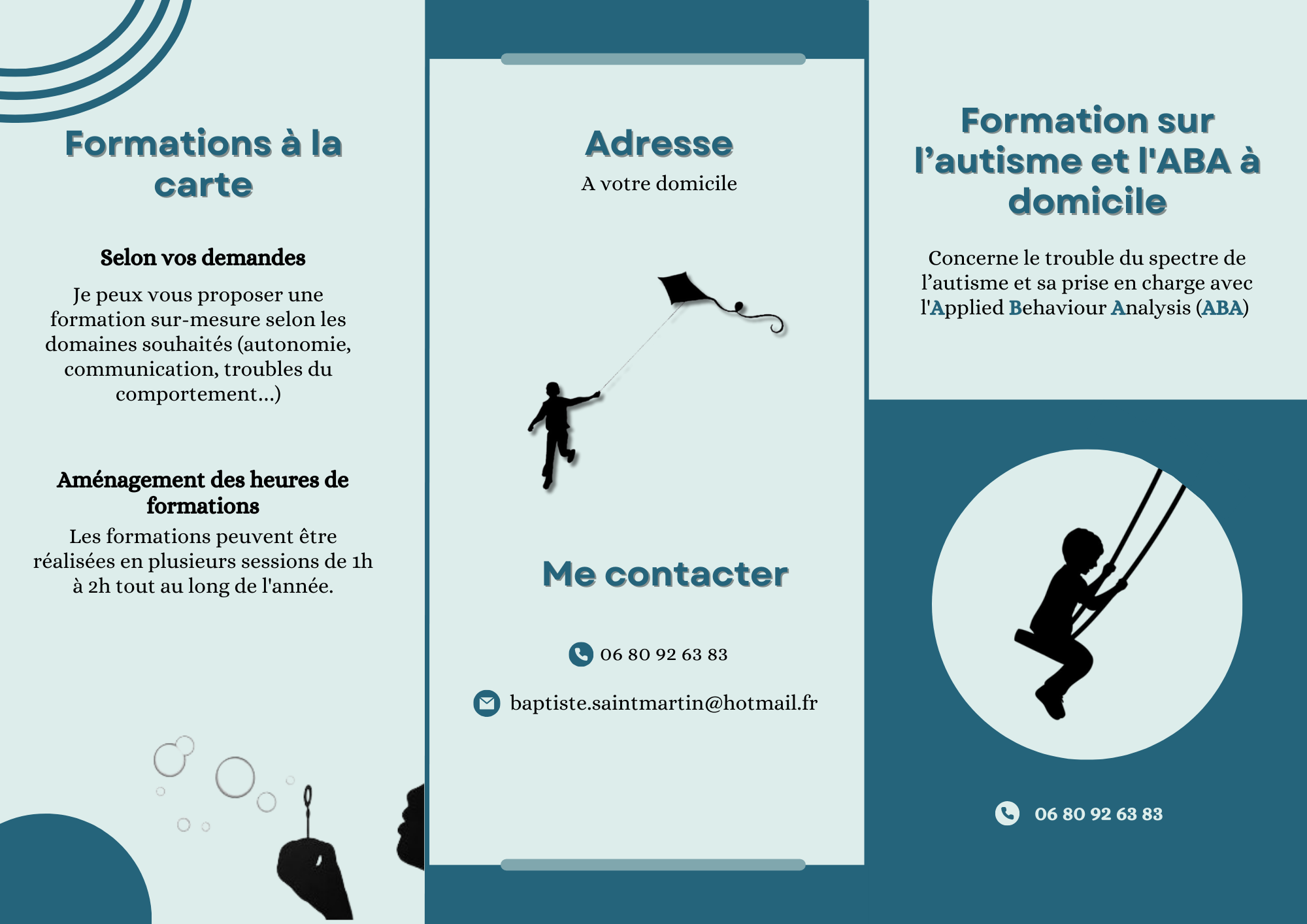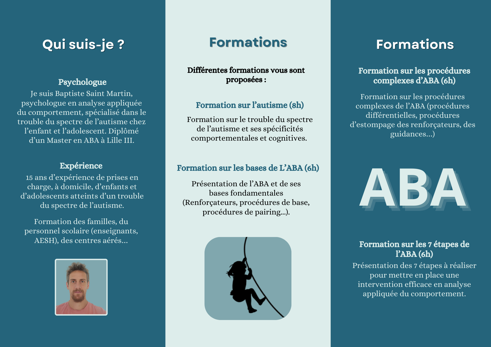 - Je propose également des formations individuelles à domicile sur le TSA et l'ABA aux parents (sans forcément assurer le suivi de leur enfant). Ouvert à tous.