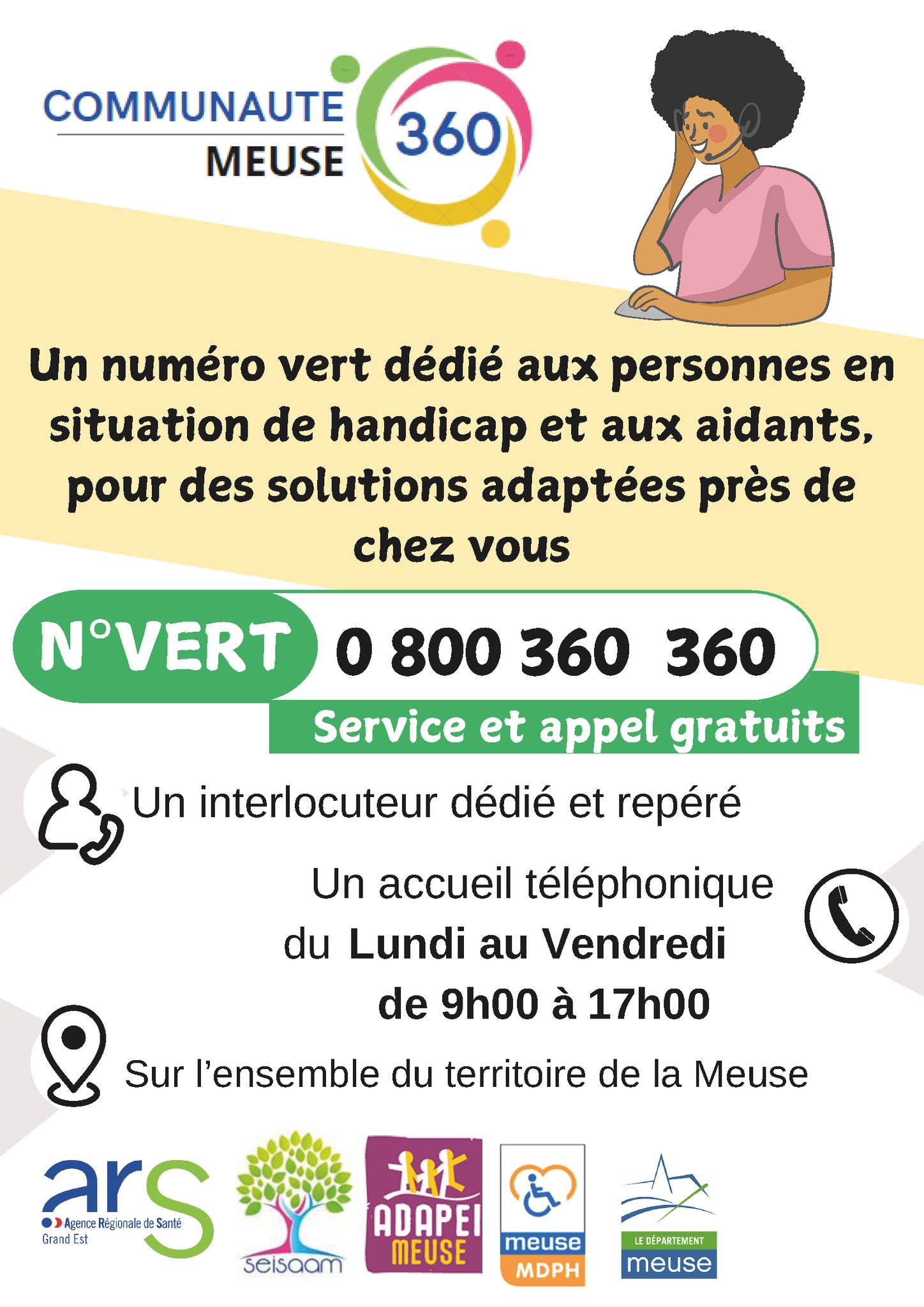 Les Communautés 360 sont accessibles via le 0 800 360 360 (accessible aux personnes sourdes et malentendantes). Ce numéro permet d’entrer directement en relation avec les acteurs impliqués dans l’accompagnement des personnes en situation de handicap sur un bassin de vie. Les appels sont réceptionnés par une équipe de conseillers en parcours basée dans le département de l’appelant, la « communauté 360 ».