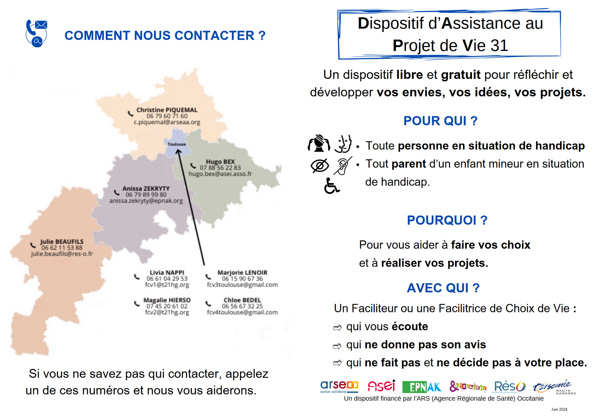 Informations Les DAPV sont implantés sur chaque département, composés d'assistants aux projets de vie, ils accompagnent gratuitement toute personne se sentant dans une situation de handicap (reconnu ou non) ou proche aidant, sur tous les projets de vie (logement, emploi, loisirs, vie affective, santé, droits etc.).