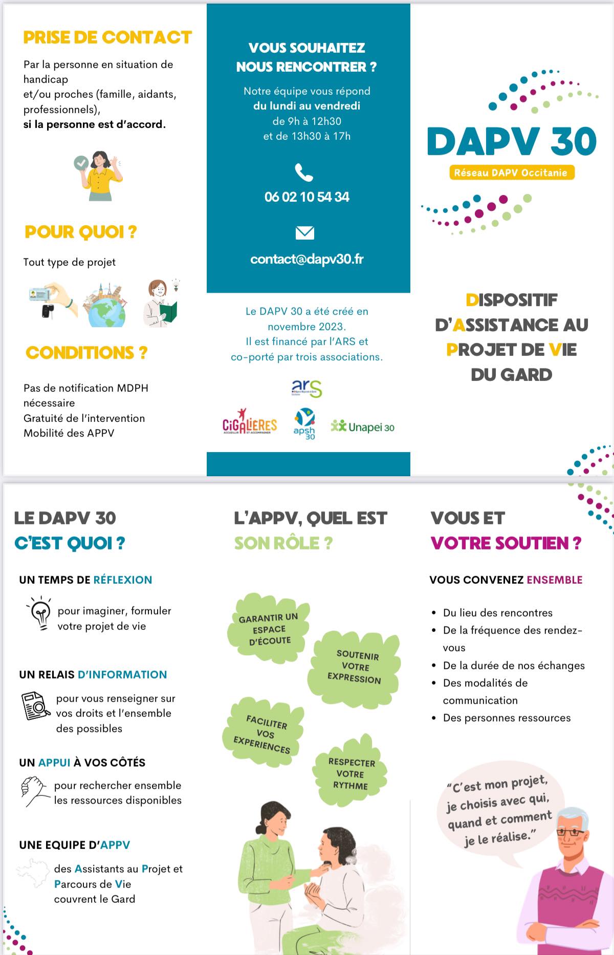 Informations Le Dispositif d'Assistance au Projet de vie - DAPV 30 est un service de proximité qui agit en soutien des personnes en situation de handicap, et des proches aidants, dans la réalisation de leur projet de vie.