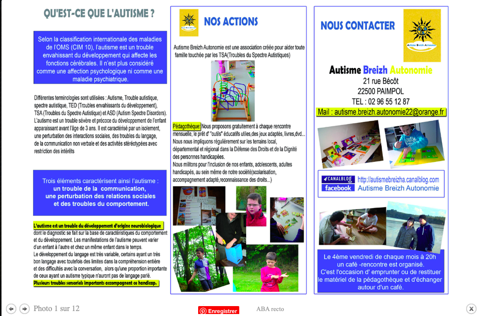 Information(s) complémentaire(s) sur les services proposésAssociation bretonne dont le but est d'aider et d'informer toute personne touchée de près ou de loin par le handicap mental et particulièrement l'autisme.